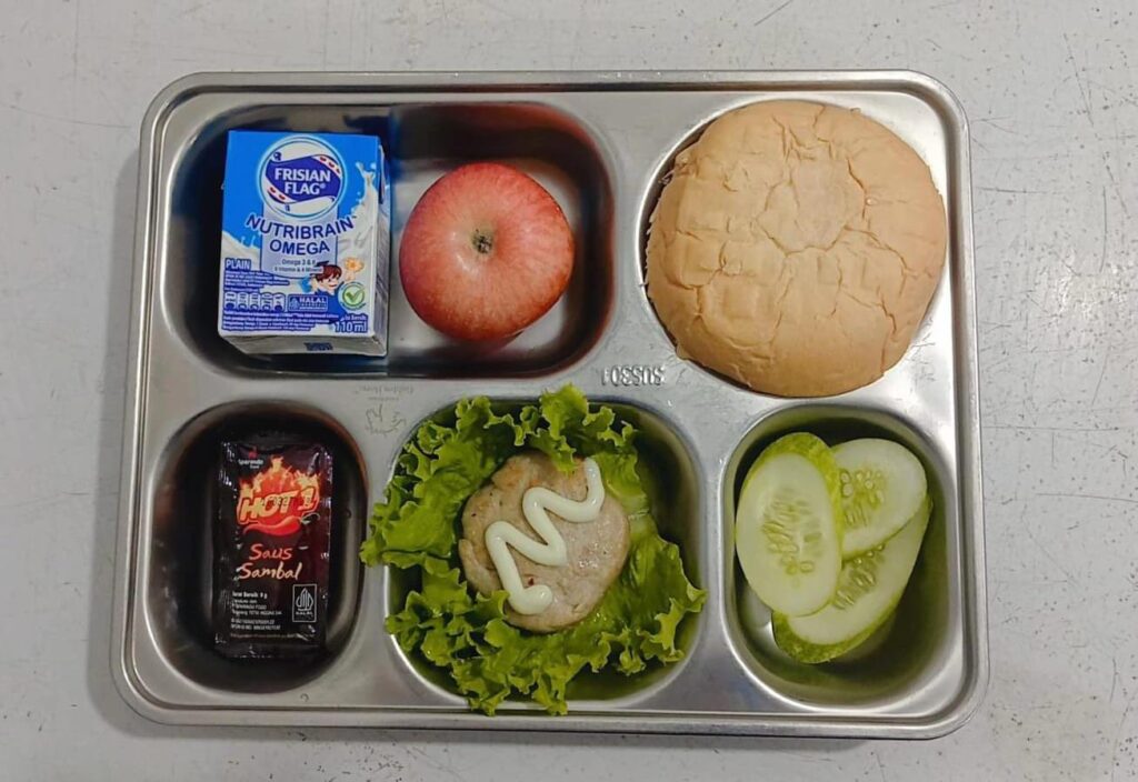 Pada pelaksanaan hari ini, menu yang disajikan berupa burger patty ayam dilengkapi selada, timun, susu, dan buah apel. Menu tersebut disediakan dalam dua kategori porsi, yakni porsi kecil dan porsi besar, dengan komposisi nilai gizi yang telah dihitung secara rinci.